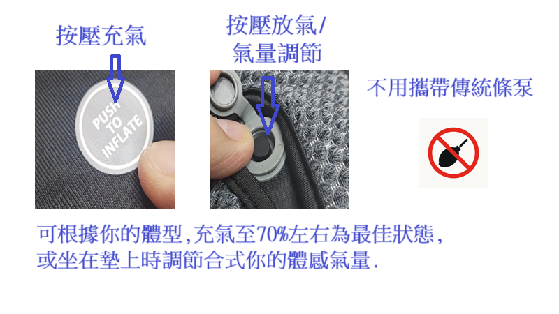 • 根據體型的胖瘦充氣在 70%左右為最佳的狀態,坐在墊子上就可以根據你的需要調節合適的氣量,體驗感強