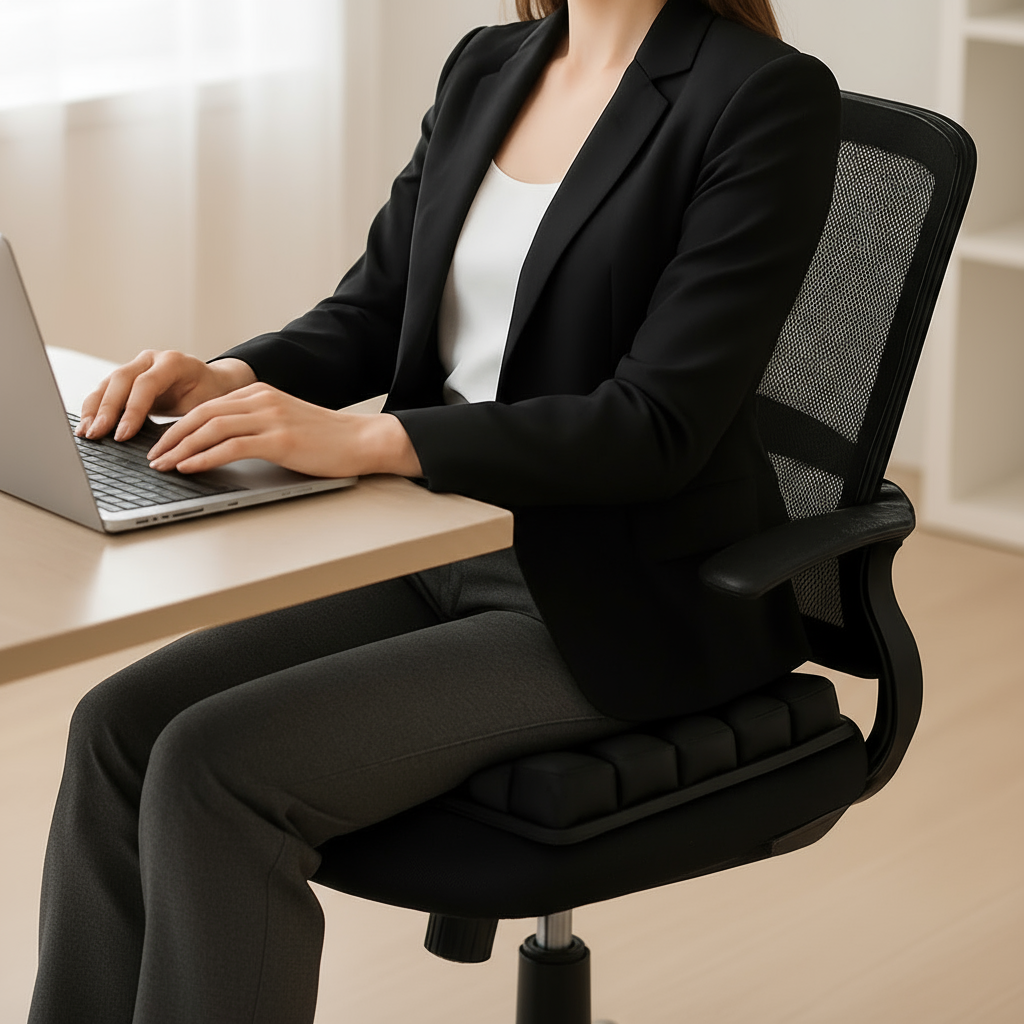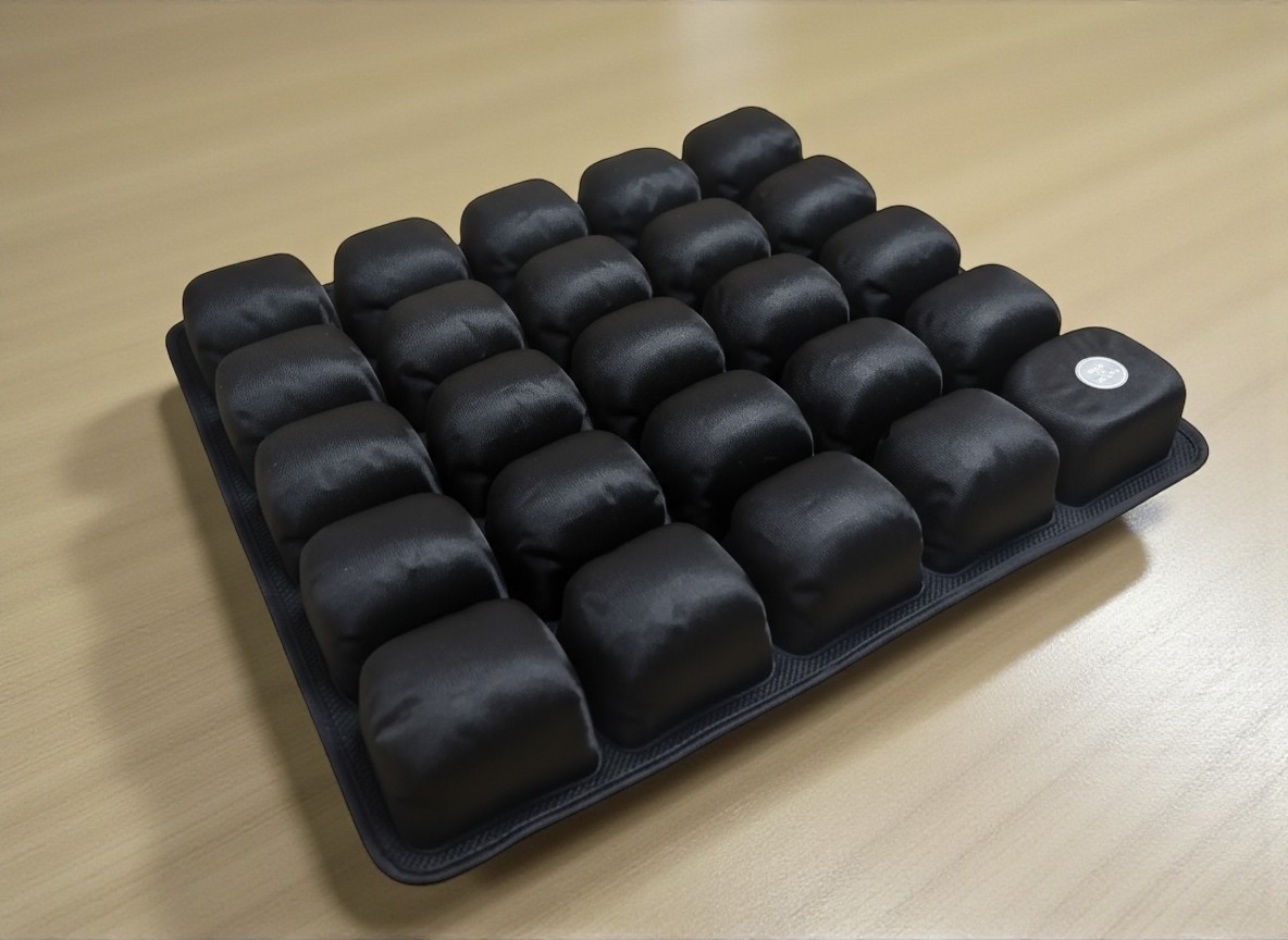 按壓式 3D 氣囊減壓坐墊由 25個 60mm高的氣道相通麵包形氣囊組成,能根據坐姿自行調節每個氣囊的氣量以及保持身體的平衡和舒適性,臀部與椅面的接觸面擴大了30%,扶托雙腿的同時也分散了受力點支撐,大大減緩了臀部和尾椎的壓迫並促進血液循環久坐的人群不再大腿痠脹和麻木,也有效避免了痔瘡、坐骨神經痛等病症,並且通風透氣,久坐不累.